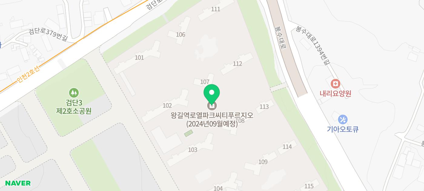 왕길역 로열파크씨티 푸르지오 교통환경으로 단지에서 1km 이내에 인천2호선을 이용할 수 있는 왕길역과 검단사거리역이 위치해 있어 역세권 프리미엄을 갖추고 있고, 가까운 거리는 아니지만 약 16.3km 거리에 KTX와 경의중앙선을 이용할 수 있는 행신역이 위치해 있습니다.