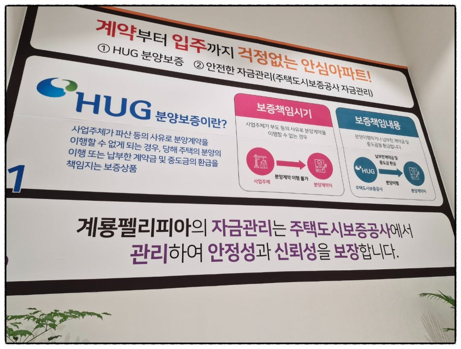 계룡 펠리피아는 주택도시보증공사 HUG에서 분양 보증을 득한 아파트로 사업주체가 부득이한 사유로 분양계약을 이행하지 못하게 될 경우에 분양 이행 및 납부한 계약금 그리고 중도금의 환급을 HUG에서 책임지게 됩니다. 여기에 더해 사업자금을 시행사가 아닌 주택도시보증공사에서 직접 관리하여 보다 투명하고 안정성 있는 자금고나리가 이루어져 수분양자에 소중한 자산을 지켜주는데 유리합니다.